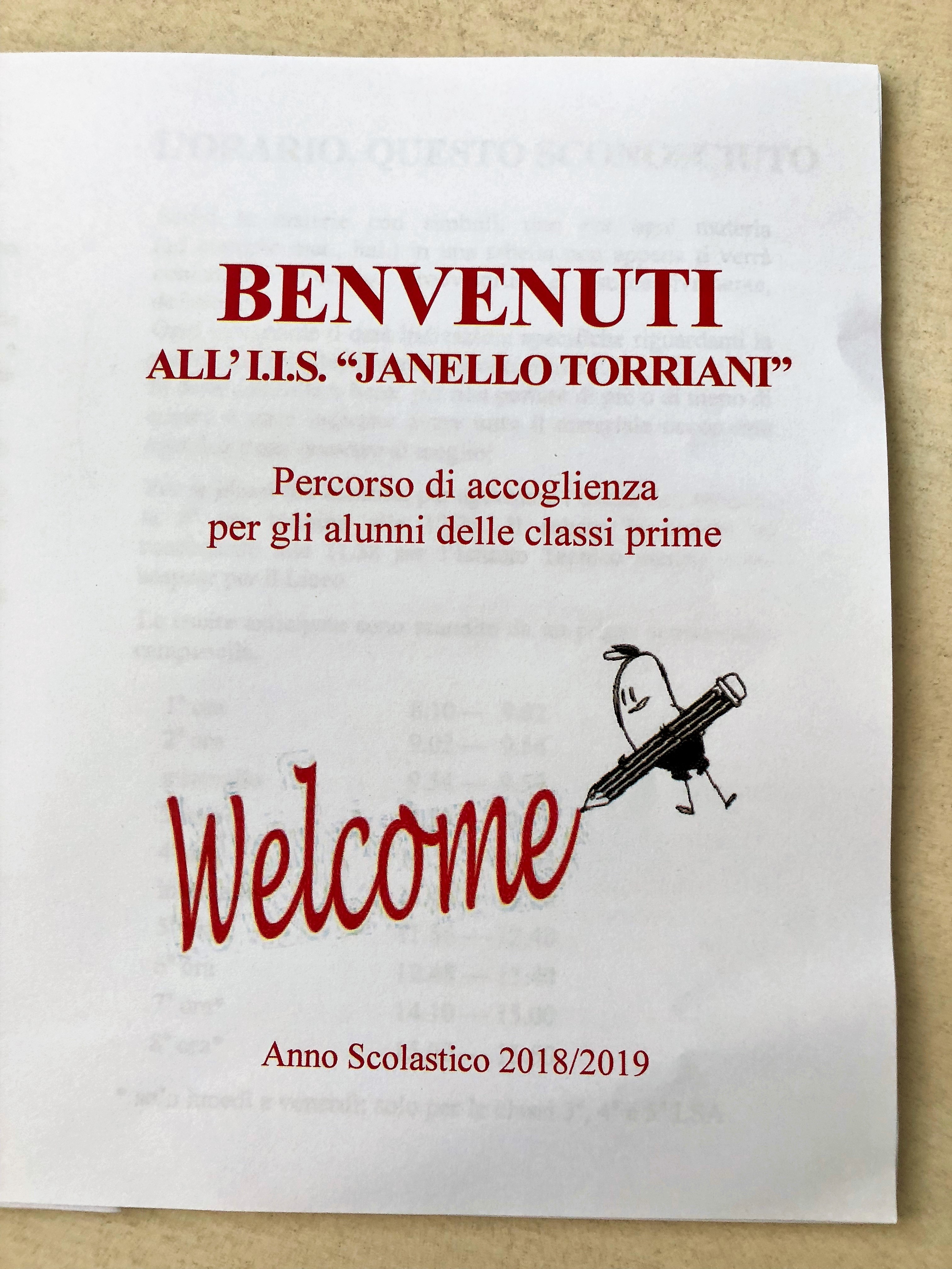 Un fascicolo con il percorso di accoglienza, curato dalla Commissione Orientamento, illustrerà ad ognuno i dati essenziali per cominciare al meglio la nuova avventura: prevede informazioni su Janello Torriani. lo scienziato cremonese a cui è intitolata la scuola, sul personale, sulla sicurezza e sulle norme di comportamento da tenere in caso di emergenza, sull'orario, il regolamento, il divieto di fumare, la raccolta differenziata.