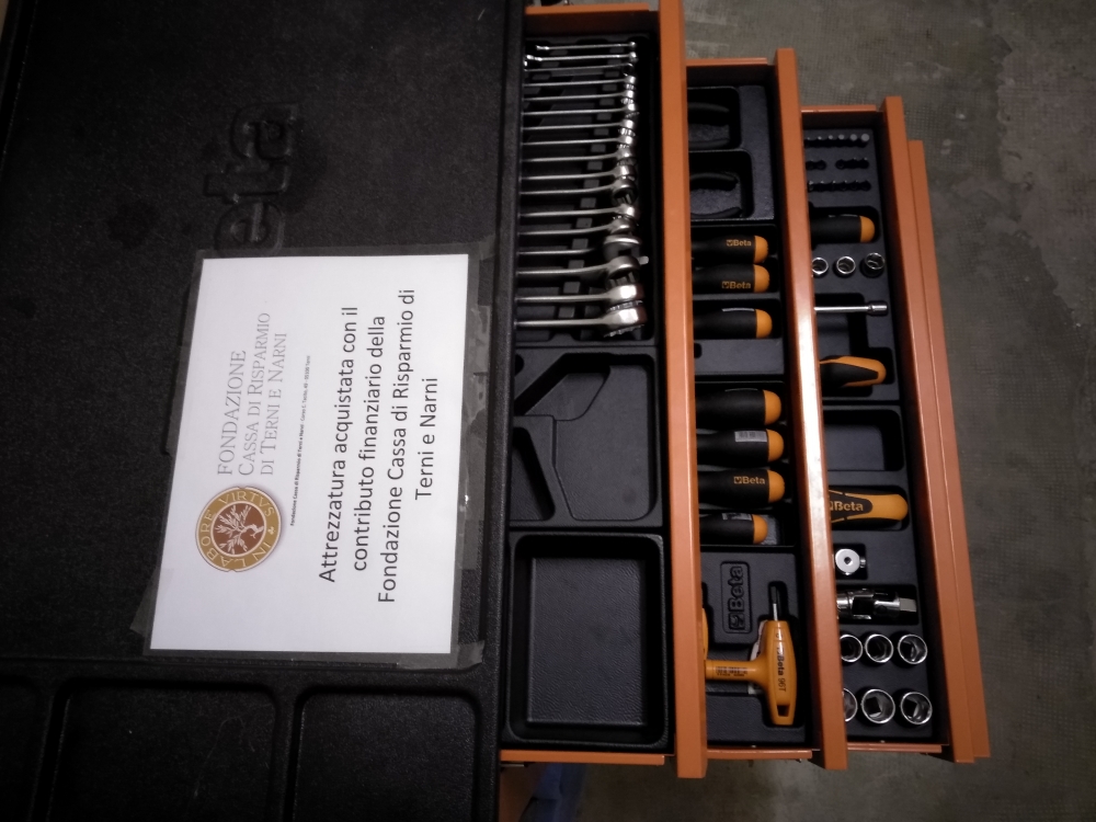 - Una cassettiera porta utensili completa di molteplici attrezzi (chiavi, giraviti, bussole, ecc.);